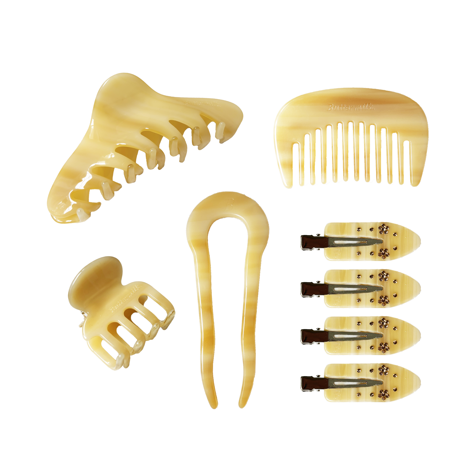 Buttermilk claw clips, combs, barrettes and hair forks are thoughtfully crafted from plant-based cellulose acetate.